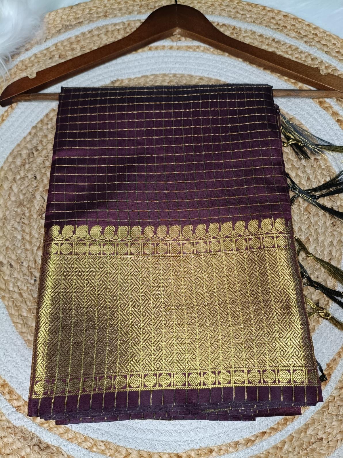 - Fabric: Premium Banarasi Silk with beautiful Golden Zari checks pattern