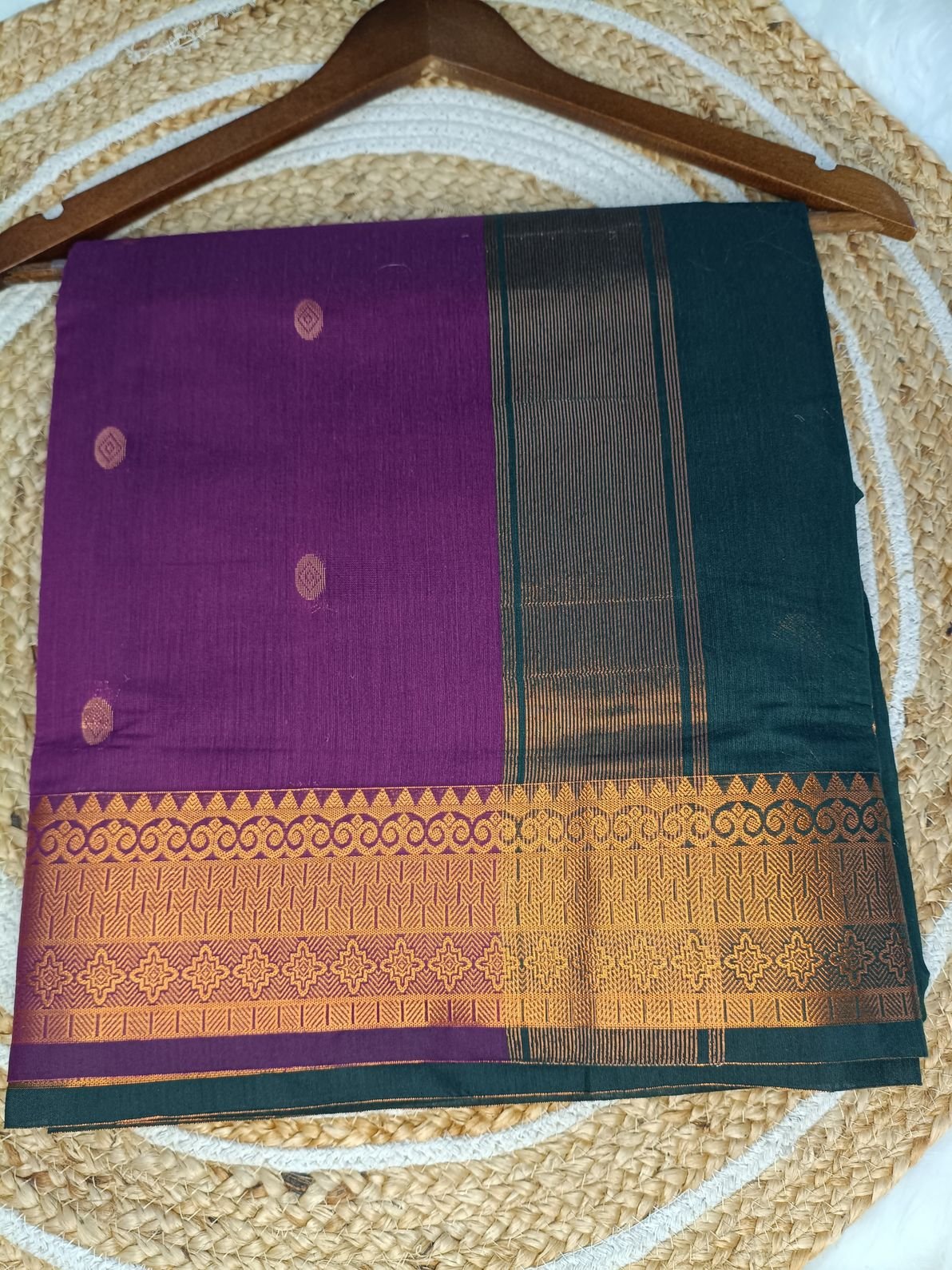 - Fabric: Premium Soft Cotton with golden zari border