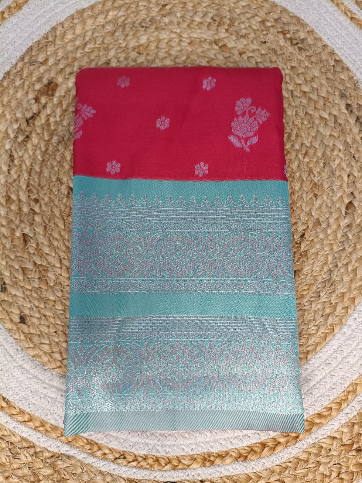- Premium Kanchi Silk saree with an elegant zari work, complemented by a contrast pallu and blouse.